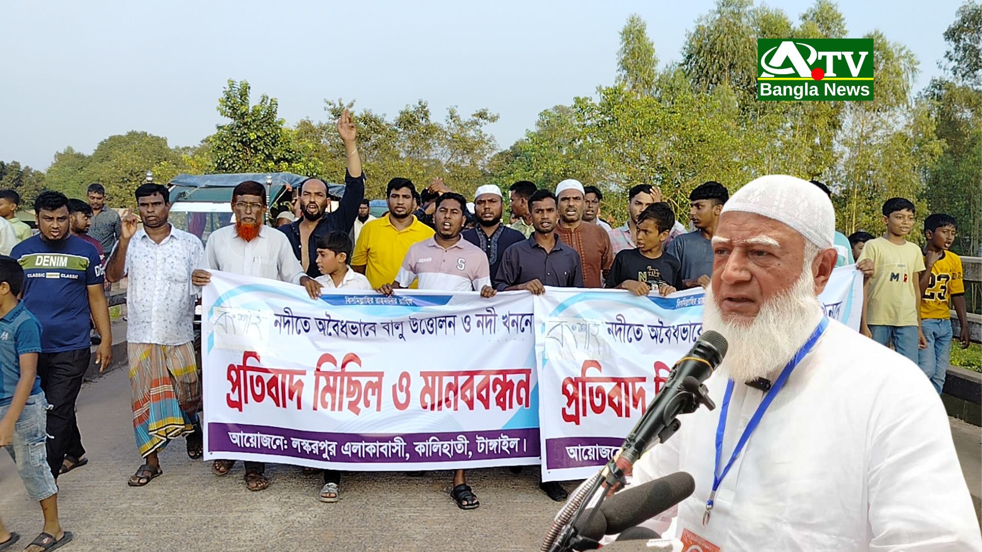 বংশাই নদীতে বালু উত্তোলন বন্ধে নাগবাড়ীতে মানববন্ধন ও প্রতিবাদ মিছিল কালিহাতী (টাঙ্গাইল) সংবাদদাতা