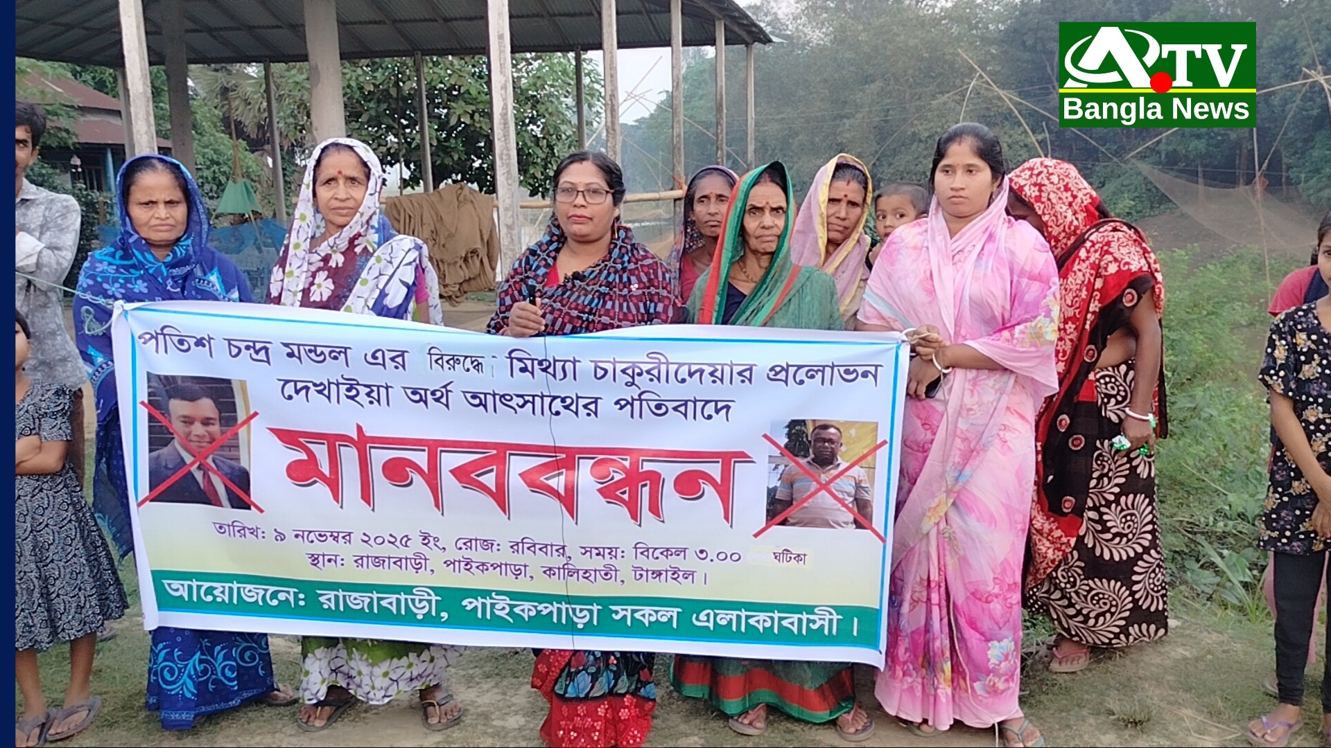 চাকরির প্রলোভনে অর্থ আত্মসাতের অভিযোগে পতিশ চন্দ্র মণ্ডলের বিরুদ্ধে মানববন্ধন টাঙ্গাইলের কালিহাতীতে চাকরির প্রলোভন দেখিয়ে সাধারণ মানুষের কাছ থেকে অর্থ