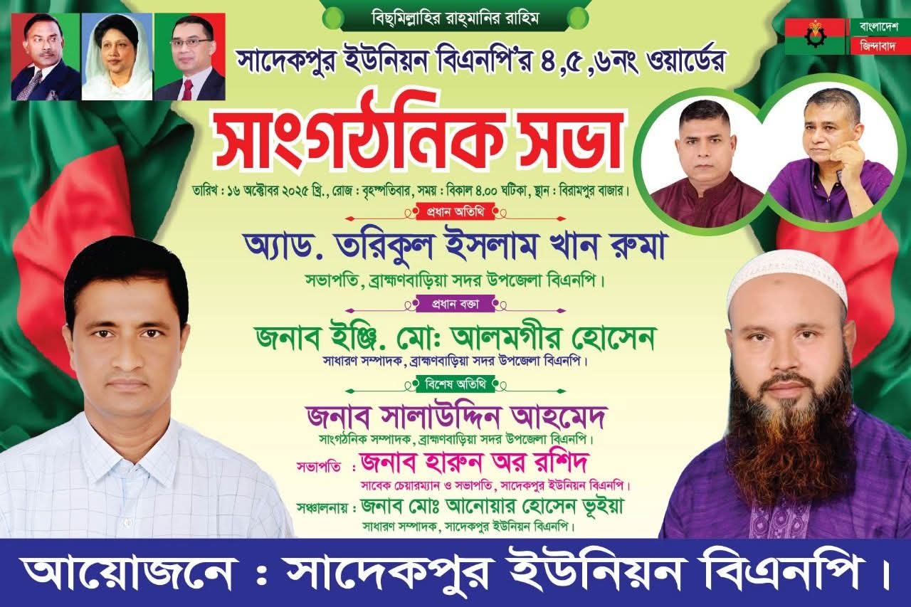 সাদেকপুর ইউনিয়ন বিএনপির ওয়ার্ড সাংগঠনিক সভা — প্রতিনিধি: মোস্তাক আহমেদ বাপ্পি আজ ১৬ অক্টোবর ২৫ ইং সাদেকপুর ইউনিয়ন বিএনপি’র ৪,৫,৬